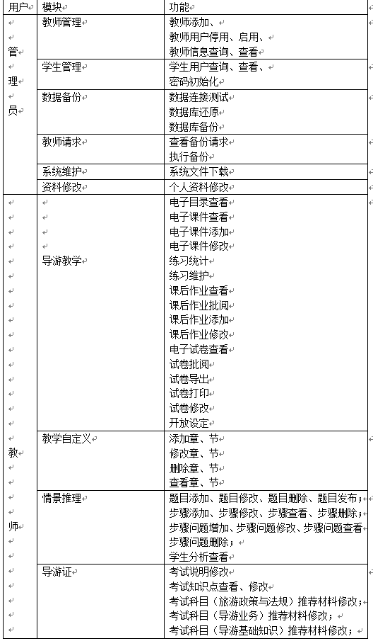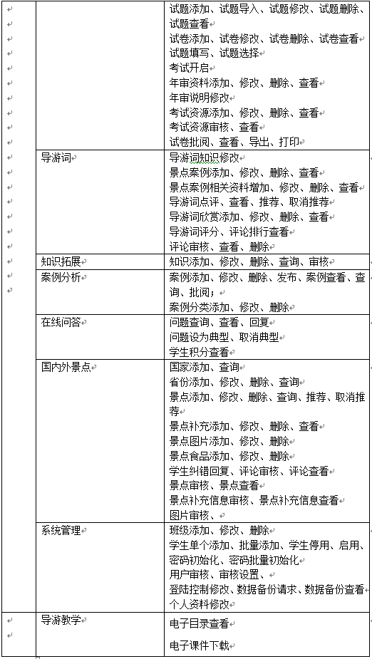 教師(shi)主要功能(neng)包括班級(ji)學生管(guan)(guan)(guan)(guan)(guan)理(li)、導(dao)游(you)(you)基礎知識管(guan)(guan)(guan)(guan)(guan)理(li)、國(guo)內(nei)(nei)導(dao)游(you)(you)知識管(guan)(guan)(guan)(guan)(guan)理(li)、國(guo)外導(dao)游(you)(you)知識管(guan)(guan)(guan)(guan)(guan)理(li)、情(qing)景題(ti)目管(guan)(guan)(guan)(guan)(guan)理(li)、導(dao)游(you)(you)證考(kao)試(shi)資料管(guan)(guan)(guan)(guan)(guan)理(li)、模(mo)擬考(kao)試(shi)、導(dao)游(you)(you)詞(ci)管(guan)(guan)(guan)(guan)(guan)理(li)、導(dao)游(you)(you)案例(li)管(guan)(guan)(guan)(guan)(guan)理(li)、知識拓展、案例(li)分析(xi)管(guan)(guan)(guan)(guan)(guan)理(li)、在線問(wen)答、國(guo)內(nei)(nei)外景點信(xin)息管(guan)(guan)(guan)(guan)(guan)理(li)等。