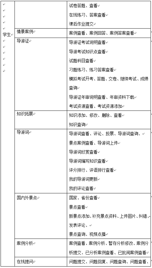 學(xue)(xue)生的主要功能(neng)是導游(you)(you)(you)教學(xue)(xue)知(zhi)識的學(xue)(xue)習(xi)、完成(cheng)情景(jing)推理(li)中包含的案(an)例及題(ti)目、導游(you)(you)(you)證(zheng)考試(shi)(shi)學(xue)(xue)習(xi)及模(mo)擬考試(shi)(shi)、導游(you)(you)(you)拓展知(zhi)識學(xue)(xue)習(xi),同時可添(tian)加新的知(zhi)識供(gong)其(qi)他同學(xue)(xue)學(xue)(xue)習(xi)、導游(you)(you)(you)詞(ci)學(xue)(xue)習(xi)并編寫(xie)導游(you)(you)(you)詞(ci)、國內外景(jing)點學(xue)(xue)習(xi)、案(an)例分析和(he)在線提問。