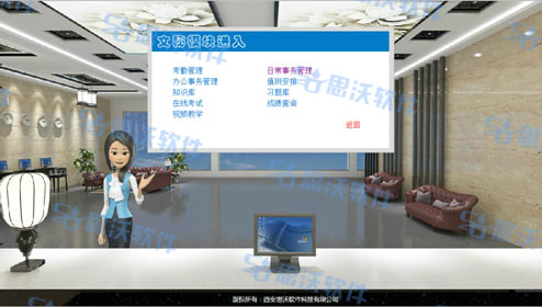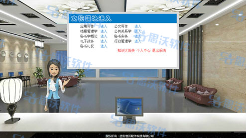 思沃文(wen)秘(mi)虛(xu)擬仿真實訓系統是我公司(si)依據文(wen)秘(mi)專業(ye)相關課程,結合(he)3D動(dong)態(tai)場(chang)景(jing)技術,引(yin)入(ru)實際文(wen)秘(mi)工作中(zhong)的(de)相關案例,融合(he)開(kai)發(fa)的(de)一款針對文(wen)秘(mi)專業(ye)實訓的(de)應用型教學平(ping)臺軟件。