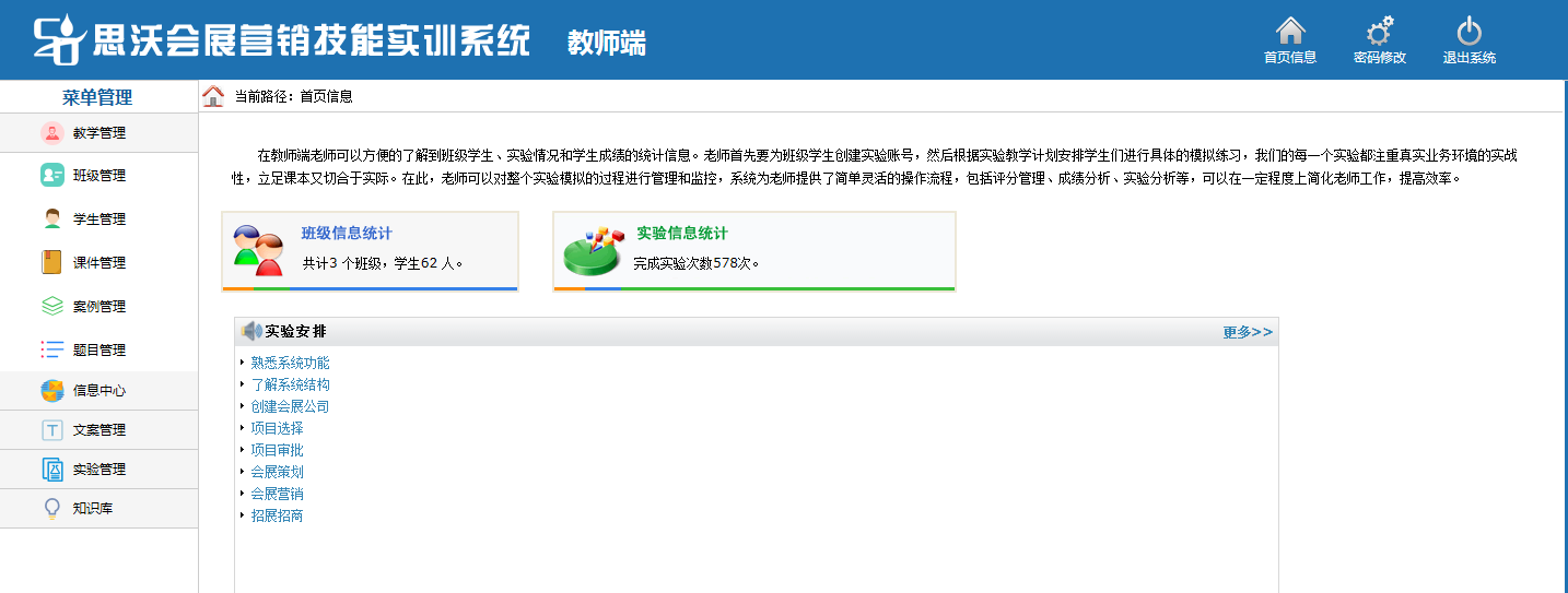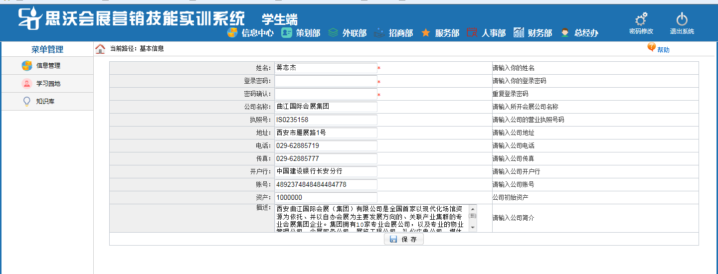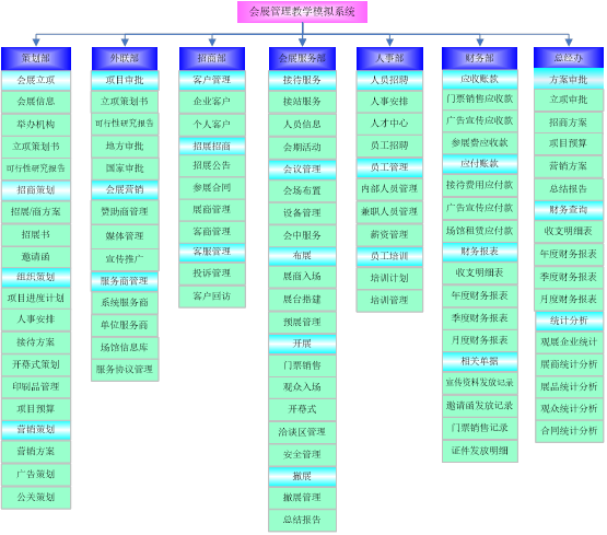 思沃會(hui)(hui)展(zhan)營銷模(mo)擬實(shi)訓系統以(yi)(yi)(yi)模(mo)擬會(hui)(hui)展(zhan)公司的策(ce)(ce)(ce)劃部(bu)(bu)、外聯部(bu)(bu)、招(zhao)商部(bu)(bu)、會(hui)(hui)展(zhan)服(fu)(fu)(fu)務(wu)部(bu)(bu)、人(ren)事(shi)部(bu)(bu)、財務(wu)部(bu)(bu)以(yi)(yi)(yi)及(ji)總(zong)經(jing)辦7大業(ye)務(wu)部(bu)(bu)門為基礎而展(zhan)開(kai)實(shi)驗操作(zuo)的。該教學(xue)平(ping)臺軟件(jian)業(ye)務(wu)內容包括了:項(xiang)目(mu)上報(bao)審批、項(xiang)目(mu)的策(ce)(ce)(ce)劃安(an)排(pai)、服(fu)(fu)(fu)務(wu)商管理、人(ren)事(shi)招(zhao)聘與(yu)(yu)管理、會(hui)(hui)展(zhan)的現場服(fu)(fu)(fu)務(wu)與(yu)(yu)合同(tong)管理等(deng)等(deng),讓學(xue)生(sheng)通(tong)過實(shi)驗感受(shou)會(hui)(hui)展(zhan)項(xiang)目(mu)的系統化管理流(liu)程(cheng)與(yu)(yu)業(ye)務(wu)操作(zuo)內容,不但(dan)能(neng)夠了解會(hui)(hui)展(zhan)項(xiang)目(mu)從(cong)立項(xiang)審批到策(ce)(ce)(ce)劃、宣傳、招(zhao)展(zhan)招(zhao)商、現場服(fu)(fu)(fu)務(wu)以(yi)(yi)(yi)及(ji)會(hui)(hui)后(hou)總(zong)結各個(ge)環節(jie)的業(ye)務(wu),同(tong)時還可(ke)以(yi)(yi)(yi)掌握各種文案的寫作(zuo)技巧,從(cong)而讓學(xue)生(sheng)真正的理解并掌握會(hui)(hui)展(zhan)這(zhe)一行(xing)業(ye)的各種知識(shi)與(yu)(yu)業(ye)務(wu)要求。為學(xue)生(sheng)以(yi)(yi)(yi)后(hou)的工作(zuo)、學(xue)習提供(gong)了一個(ge)實(shi)戰(zhan)演(yan)練(lian)的實(shi)訓平(ping)臺,增強(qiang)了學(xue)生(sheng)進入工作(zuo)崗位后(hou)的實(shi)力。
